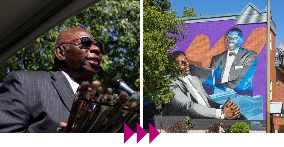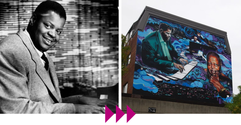 (1) Photo d’archive d’Oscar Peterson / (2) Murale « Jazz Born Here » réalisée en son honneur en 2011 par Gene Pendon et produite par MU.