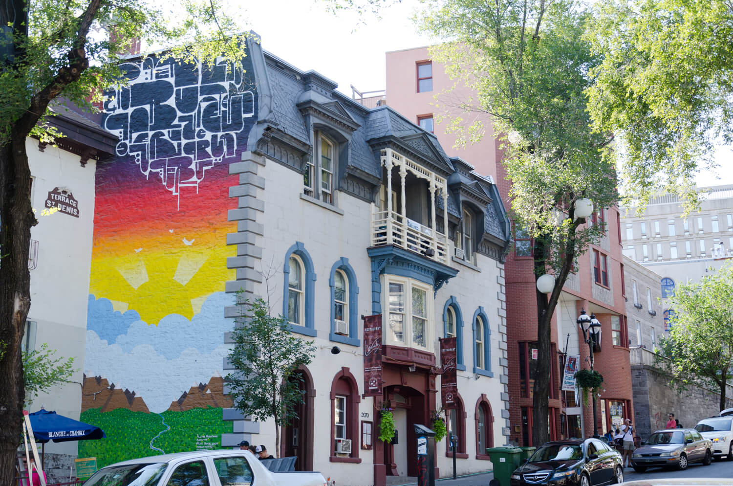 As was the case with the other murals produced in the Quartier Latin, the theme given to the artist Peru Dyer for this 800 square feet mural was “At the heart of cultural creation”. The artist’s creative source lies within his quest for the purity of a pristine world, represented by a utopian landscape, rich in resources. The lower section depicts a classic, naïve-style landscape while the clouds at the top are evoked using graffiti art applications. The mural was produced using mixed mediums, combining traditional and aerosol paints. This is the fourth mural produced by MU in the Latin Quarter.