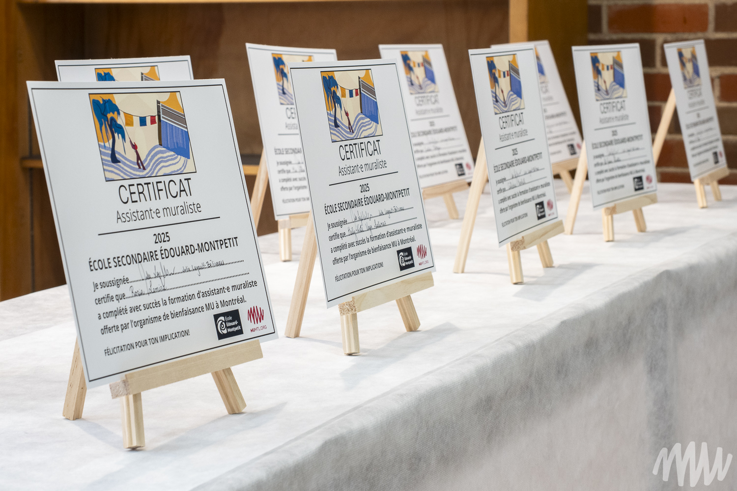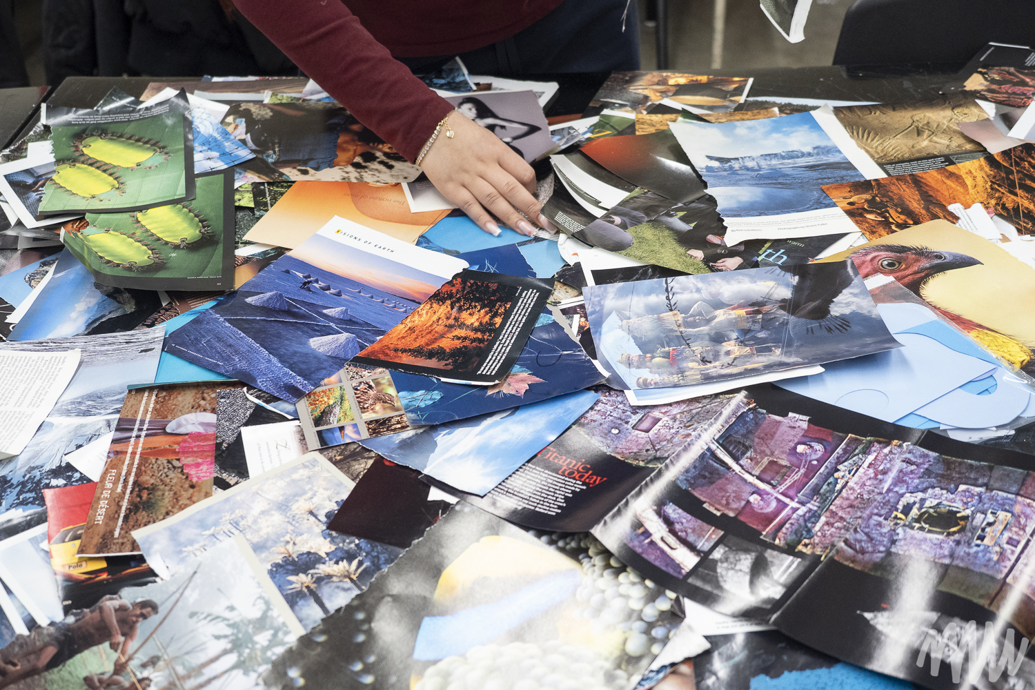 As part of a series of creative workshops offered by MU, students in the visual arts program at Édouard-Montpetit High School were invited to reflect on what inspires, drives, and unites them. The brainstorm activity took the form of a collage built from a collective lexical field, revealing themes that matter deeply to the students: music, photography, team spirit, and the importance of paying tribute to their arts program within the school space.