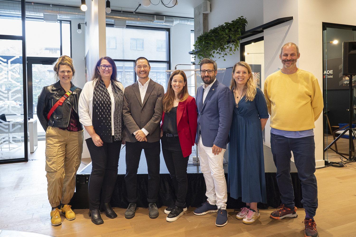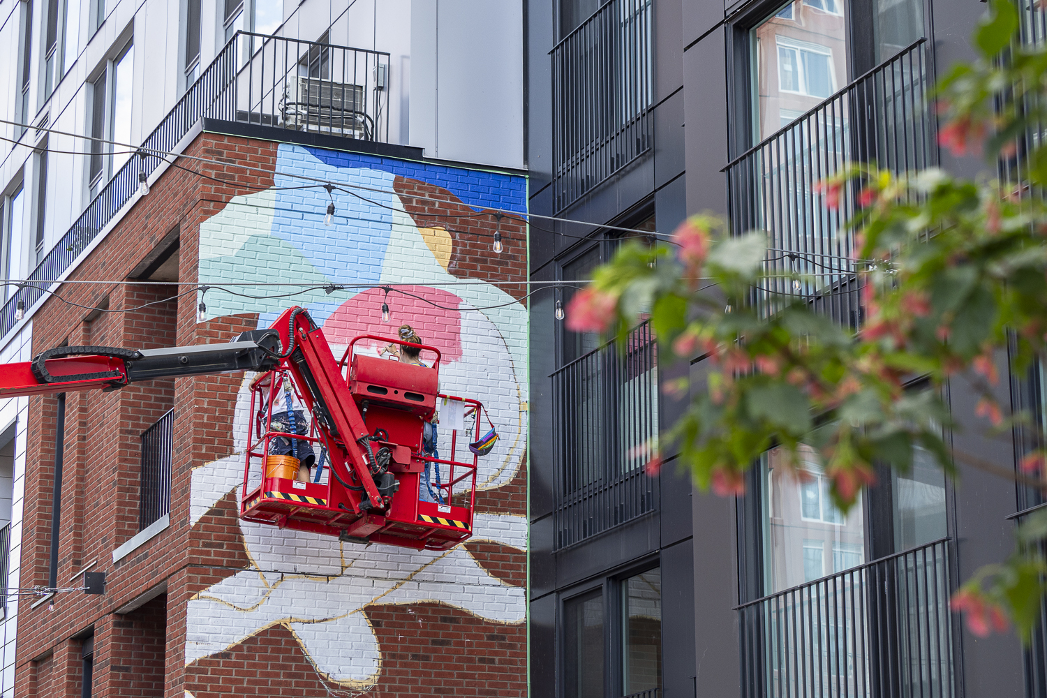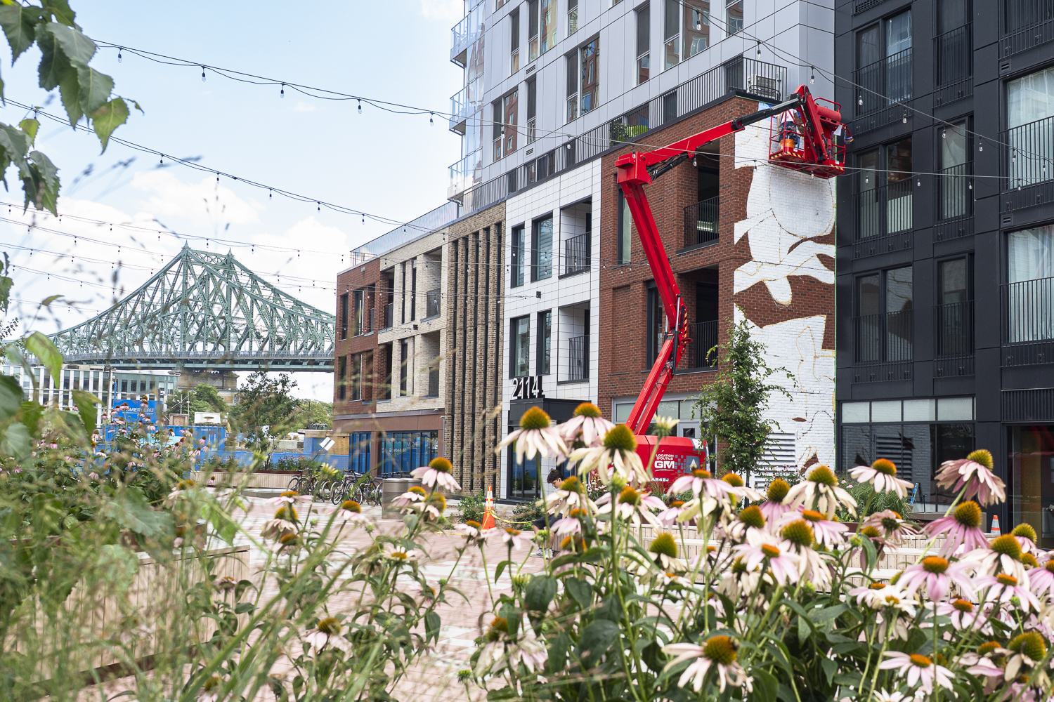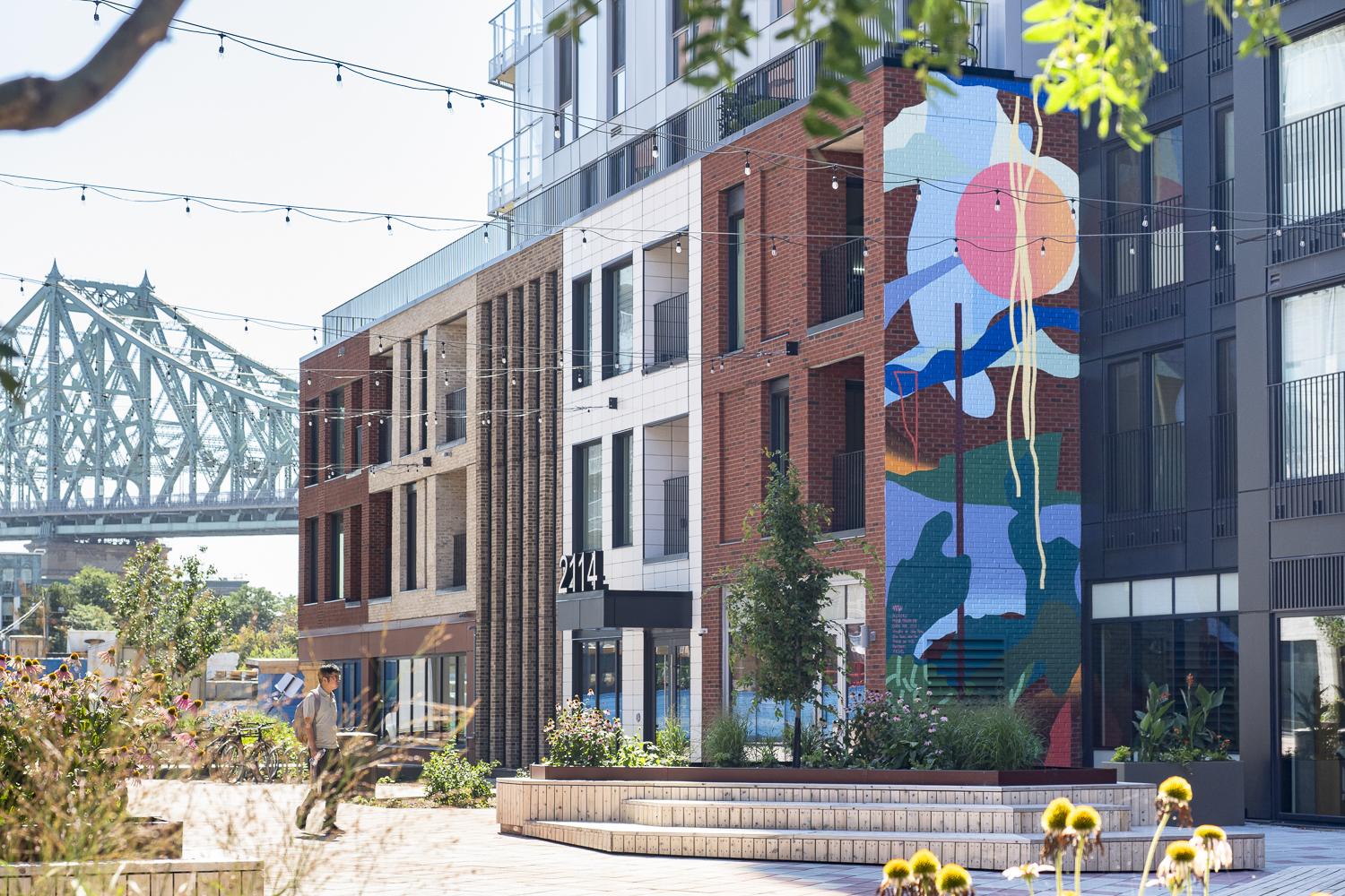 GESTION ESPLANADE CARTIER inc. a fait appel à MU pour la réalisation de deux œuvres murales afin de compléter la signature visuelle de ce nouveau quartier à proximité du pont Jacques-Cartier. Les artistes choisis, Diane Roe et MSHL, ont pu concevoir leur œuvre dès la conception des plans du quartier et ont ainsi créé des œuvres abstraites en cohérence avec le cadre bâti tout en faisant écho aux éléments architecturaux du secteur.