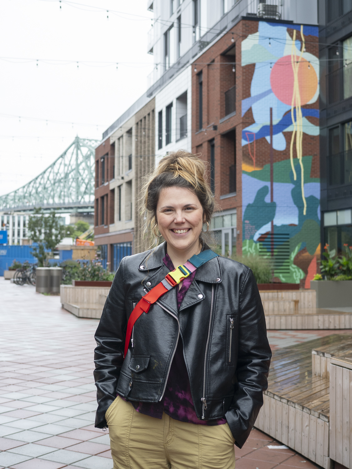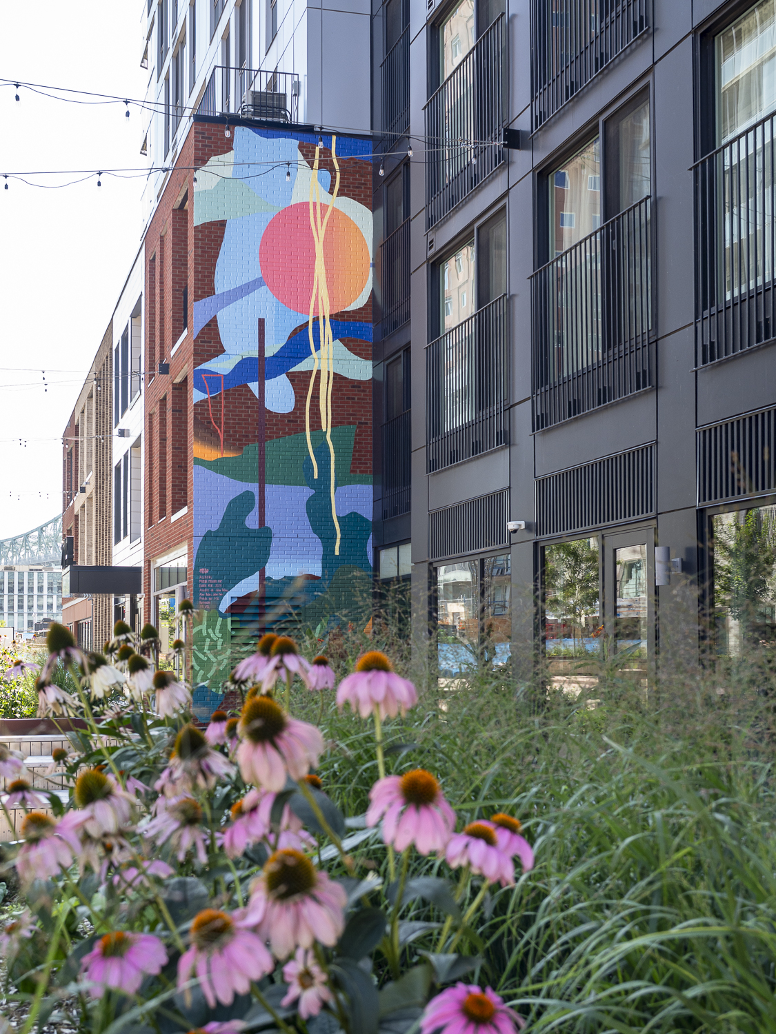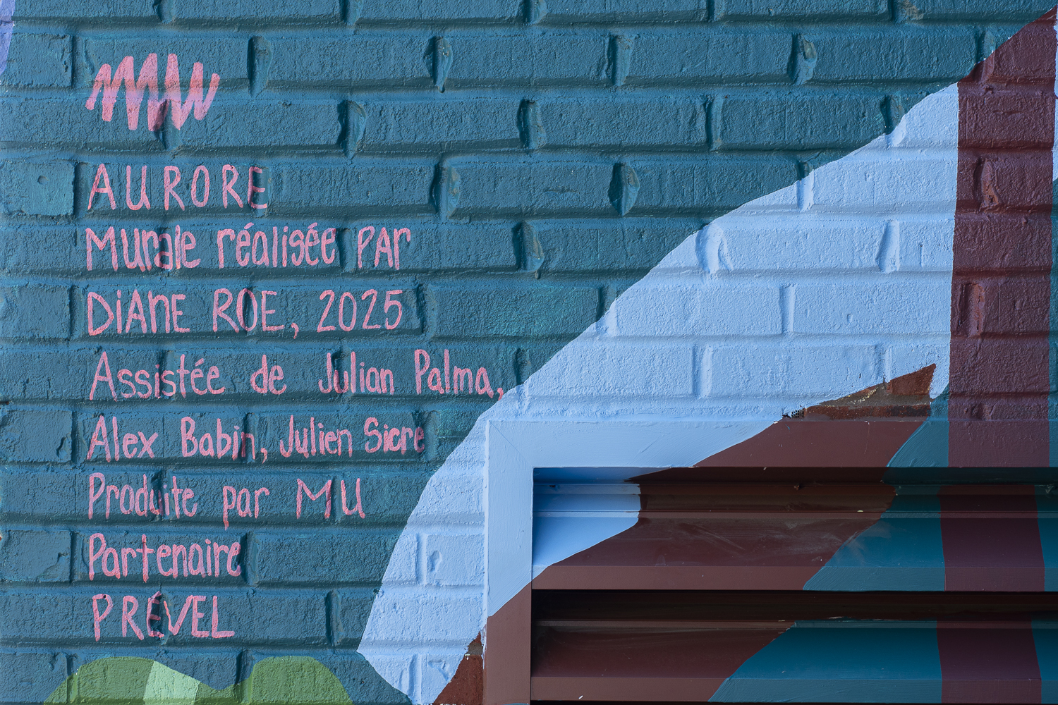Diane Roe a choisi de représenter un lever de soleil sur un paysage semi-abstrait en écho à l’éclosion de ce nouveau quartier synonyme du début d’une nouvelle vie pour les résidents. La murale agit aussi comme une fenêtre imaginaire sur le véritable soleil qui se lève dans le prolongement de l’esplanade derrière le pont Jacques-Cartier. Les nuances de bleu et de vert créent un lien avec la couleur du pont.