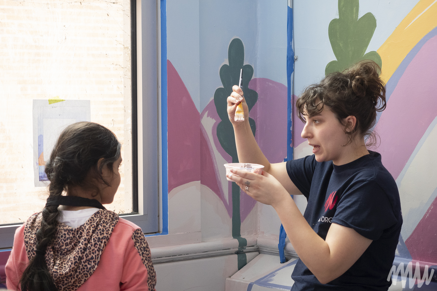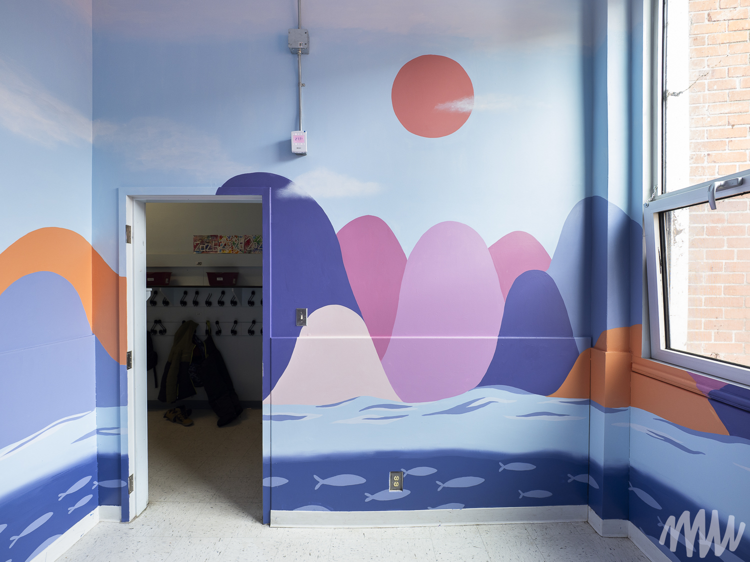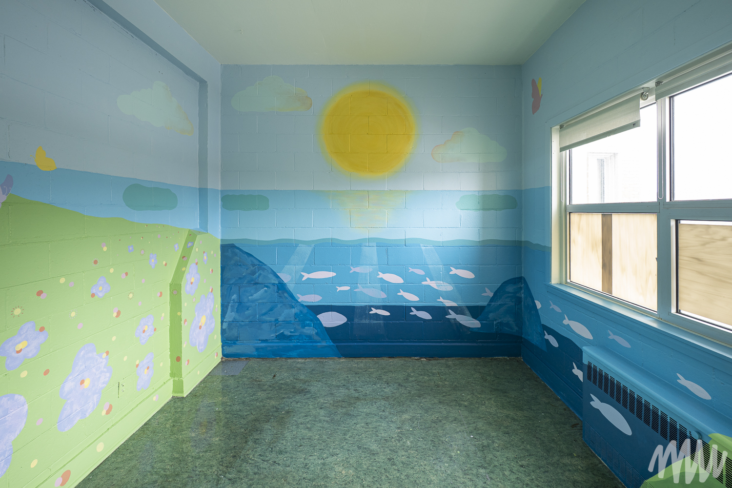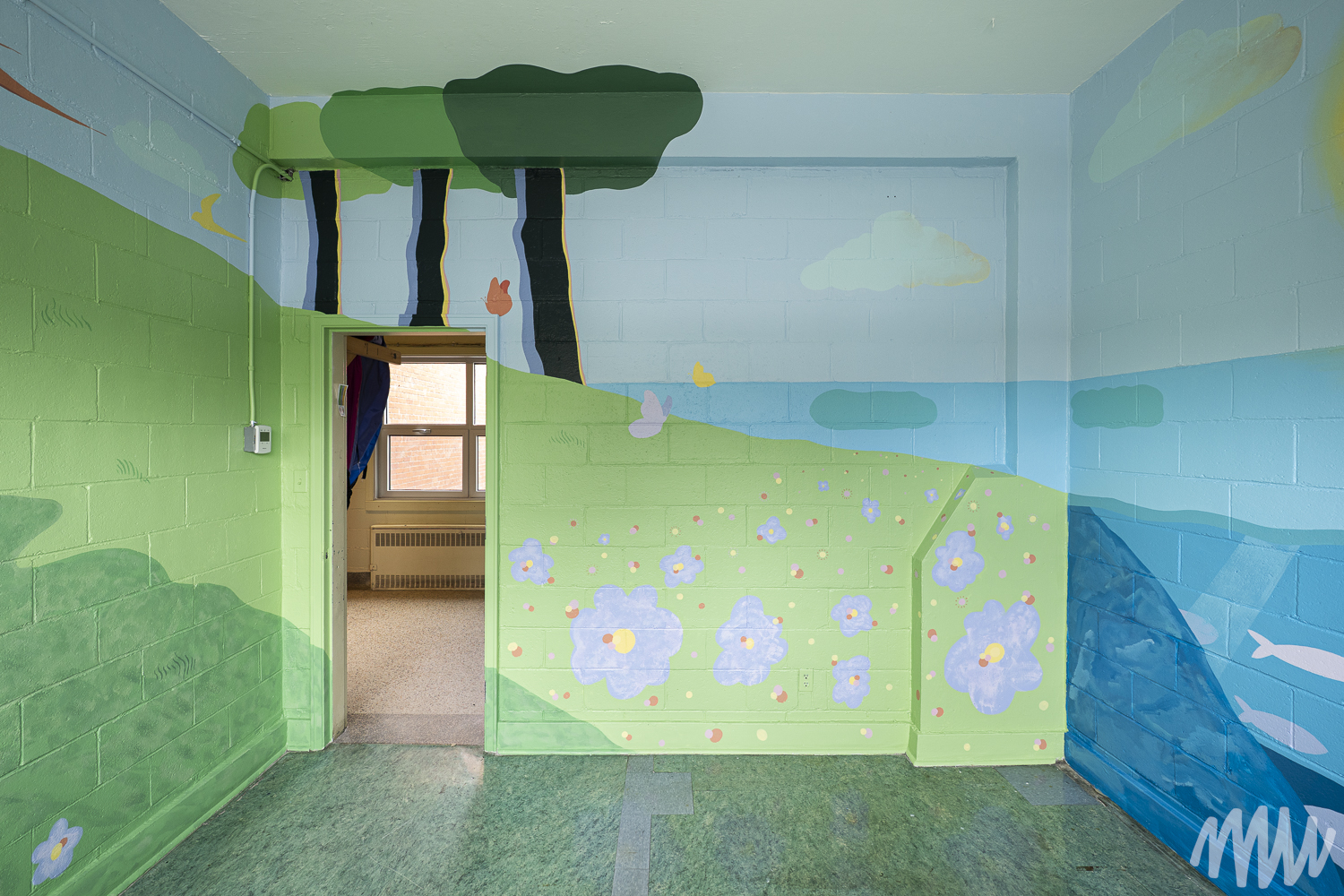Fanny, s’inspirant de l’imaginaire des jeunes élèves TSA, propose une murale qui célèbre leur saison de prédilection : l’été. On y découvre leurs idées foisonnantes — un soleil se reflétant dans le fleuve Saint-Laurent, une nature abondante, ainsi que des perroquets, poissons et papillons en liberté. Les textures de la section montagneuse, tout comme les rochers et les fleurs, ont été réalisées par les enfants de maternelle, qui ont pu laisser libre cours à la spontanéité de leur geste.