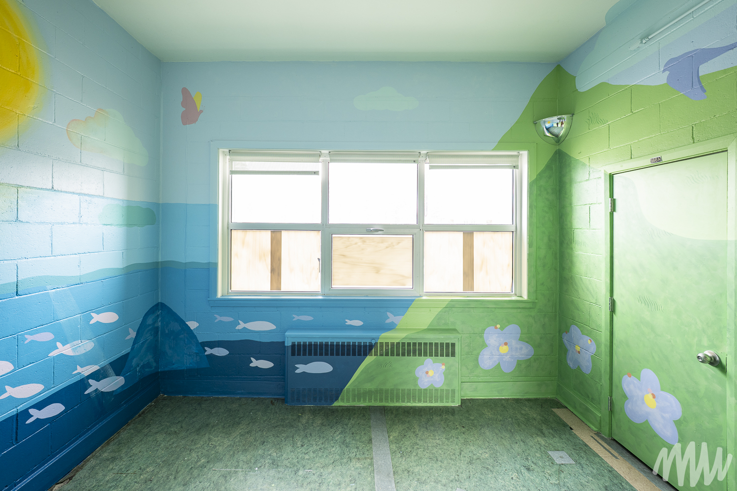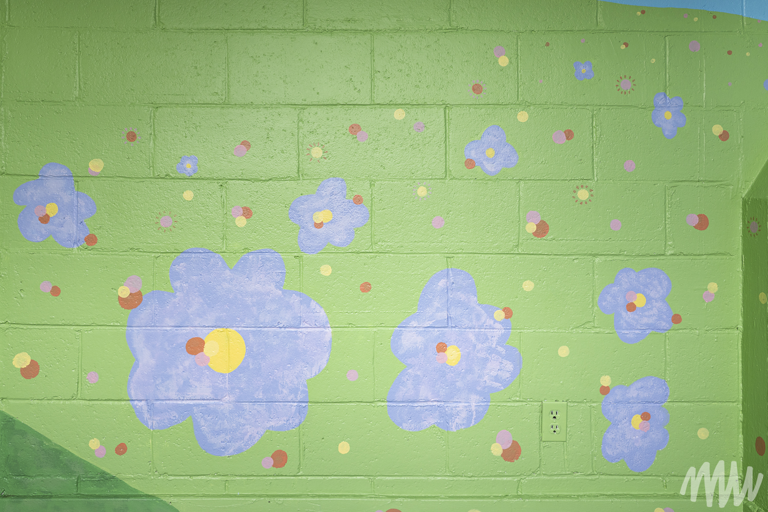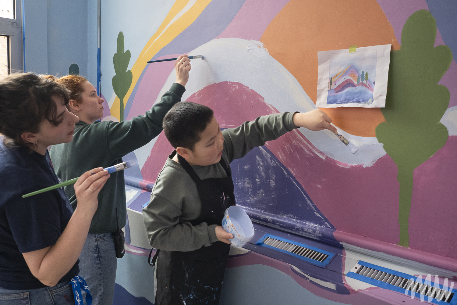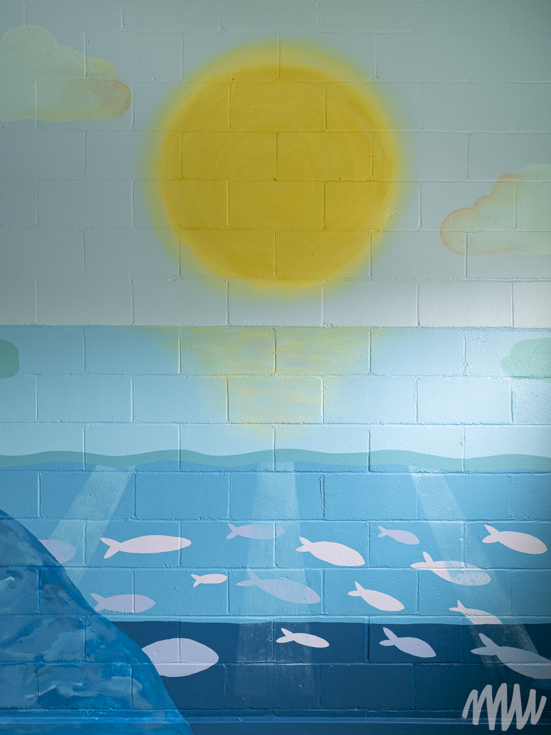 Fanny, s’inspirant de l’imaginaire des jeunes élèves TSA, propose une murale qui célèbre leur saison de prédilection : l’été. On y découvre leurs idées foisonnantes — un soleil se reflétant dans le fleuve Saint-Laurent, une nature abondante, ainsi que des perroquets, poissons et papillons en liberté. Les textures de la section montagneuse, tout comme les rochers et les fleurs, ont été réalisées par les enfants de maternelle, qui ont pu laisser libre cours à la spontanéité de leur geste.