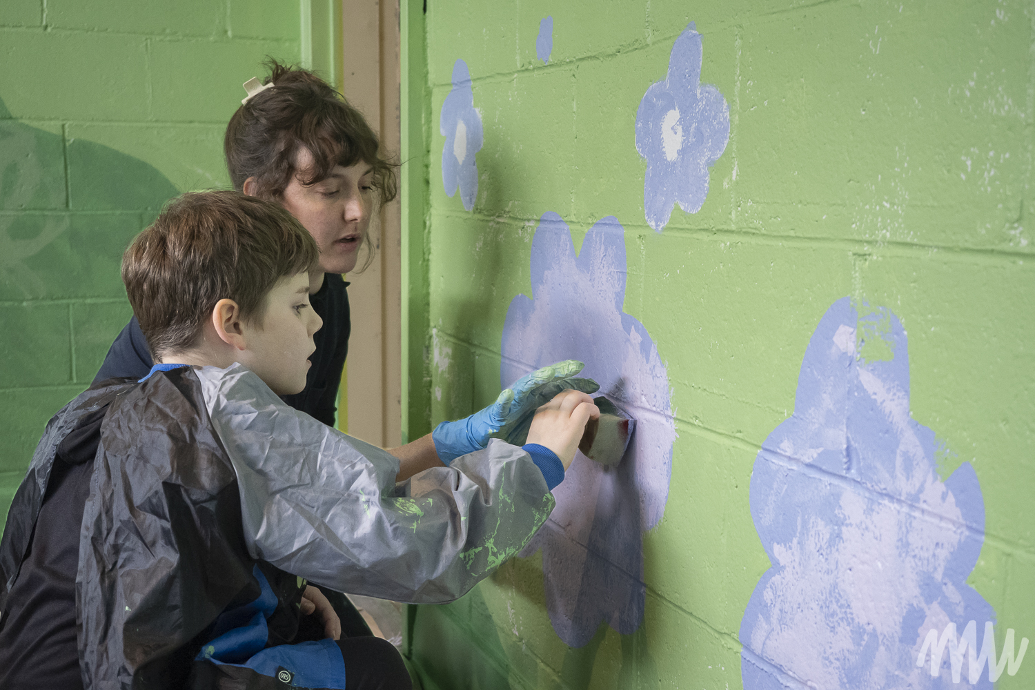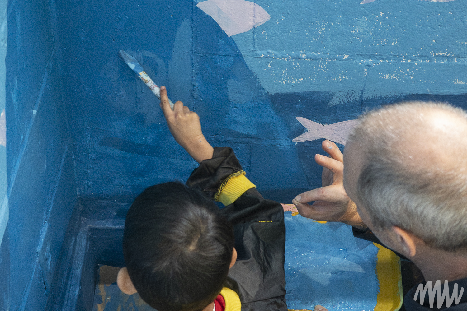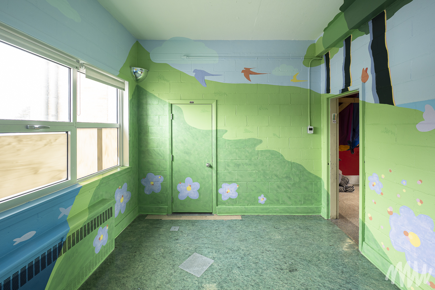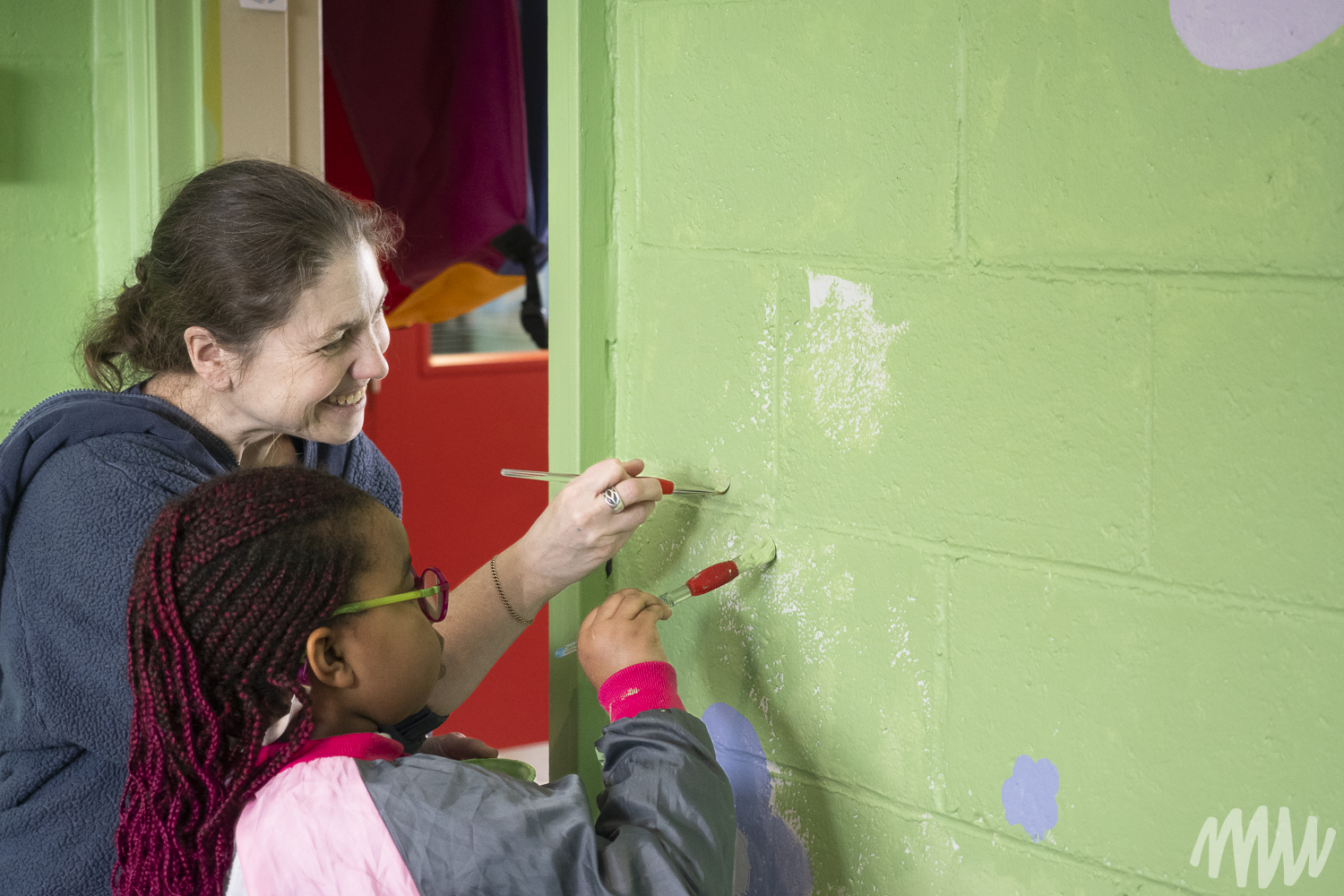 Fanny, s’inspirant de l’imaginaire des jeunes élèves TSA, propose une murale qui célèbre leur saison de prédilection : l’été. On y découvre leurs idées foisonnantes — un soleil se reflétant dans le fleuve Saint-Laurent, une nature abondante, ainsi que des perroquets, poissons et papillons en liberté. Les textures de la section montagneuse, tout comme les rochers et les fleurs, ont été réalisées par les enfants de maternelle, qui ont pu laisser libre cours à la spontanéité de leur geste.