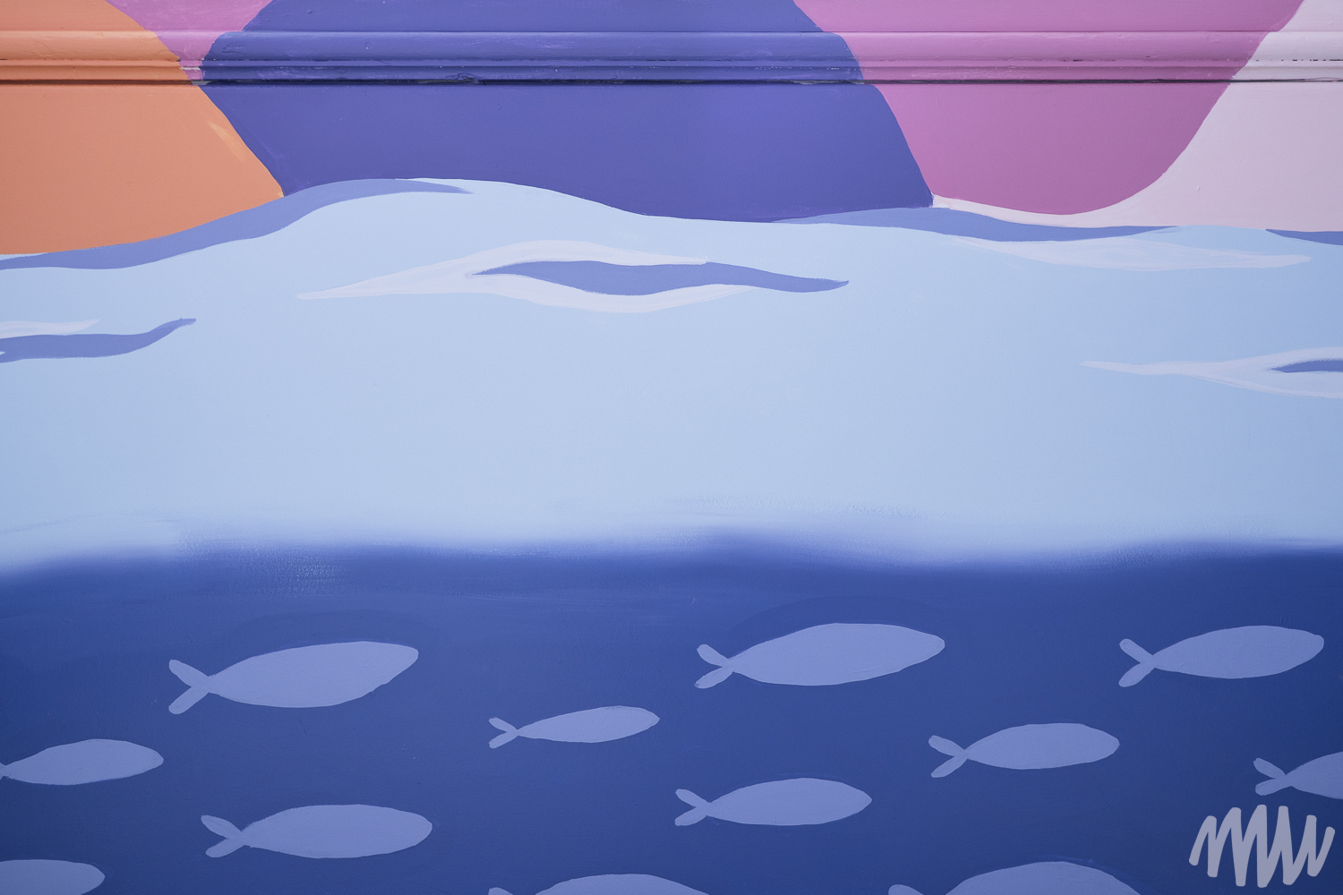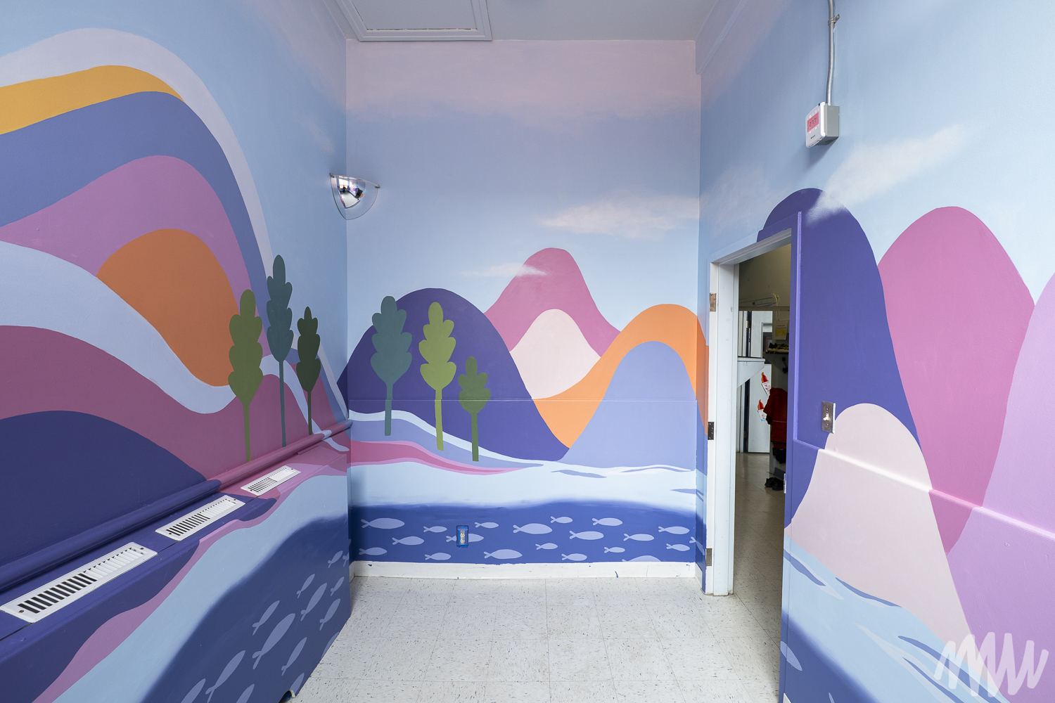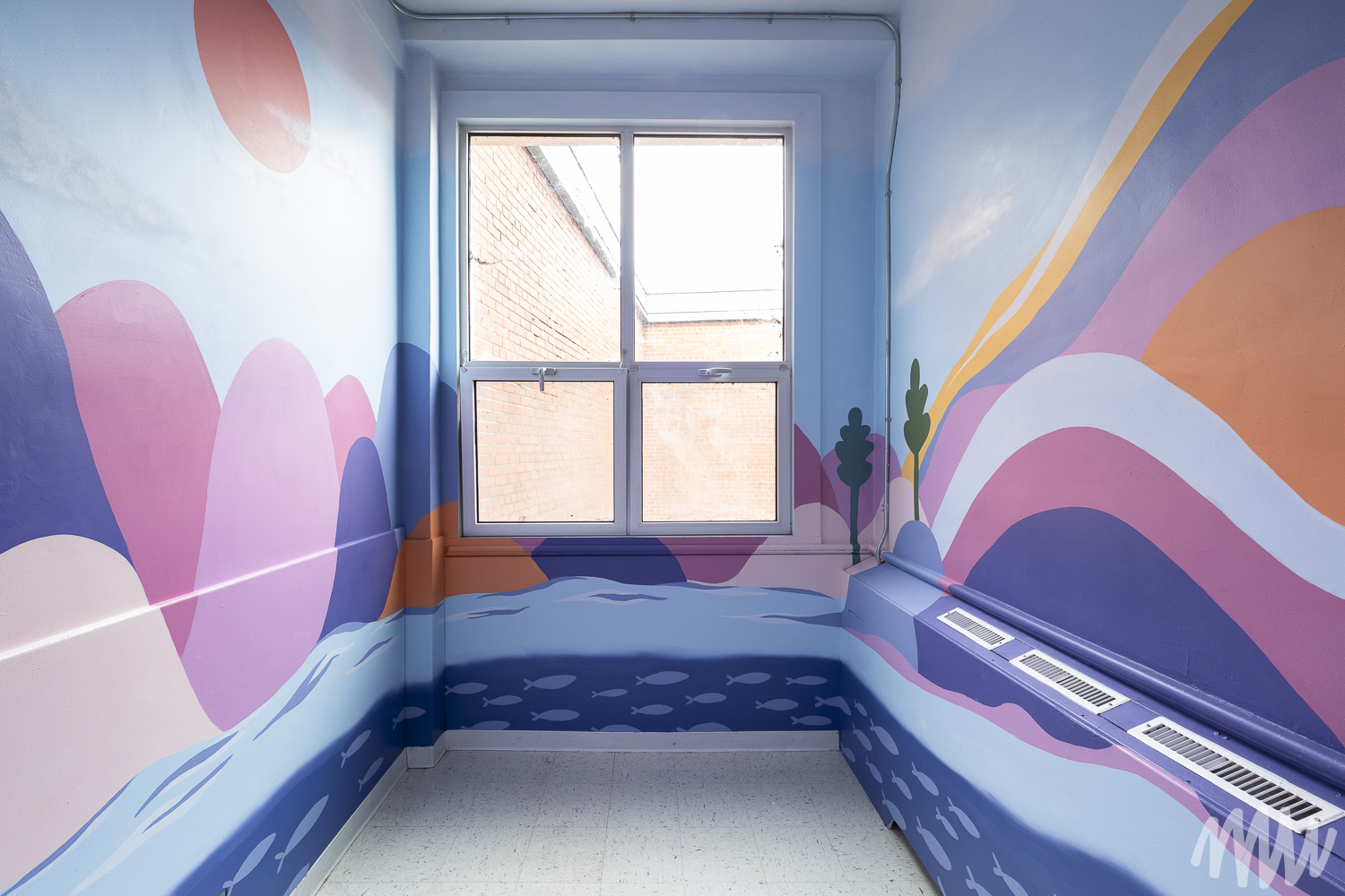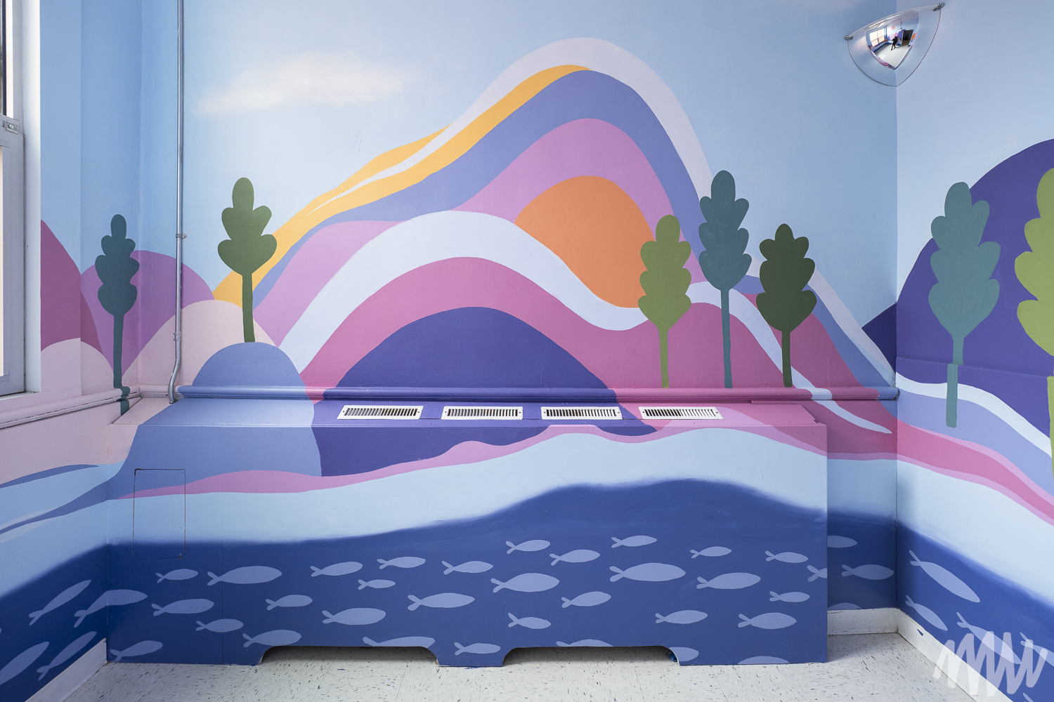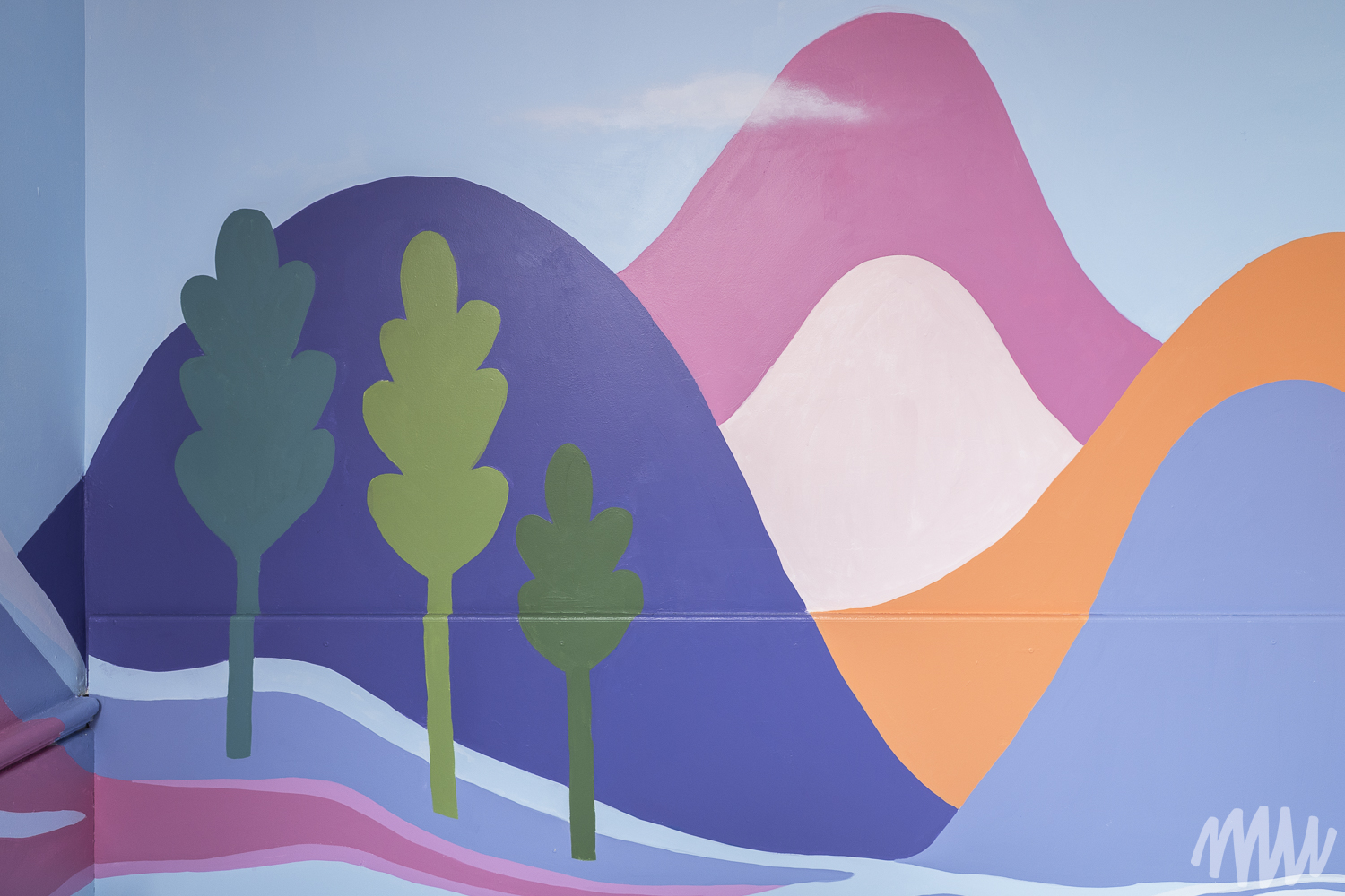 Margaux a conçu une murale sensorielle pensée comme un outil de transition, accompagnant le passage de l’agitation au calme grâce à un chemin visuel doux et continu. Les vagues s’y métamorphosent peu à peu en montagnes, illustrant le passage du mouvement vers la stabilité. Les formes, issues de l’imaginaire des enfants, s’inspirent du rythme et de la respiration. L’équilibre entre couleurs chaudes et froides évoque un sentiment de sécurité et d’apaisement.