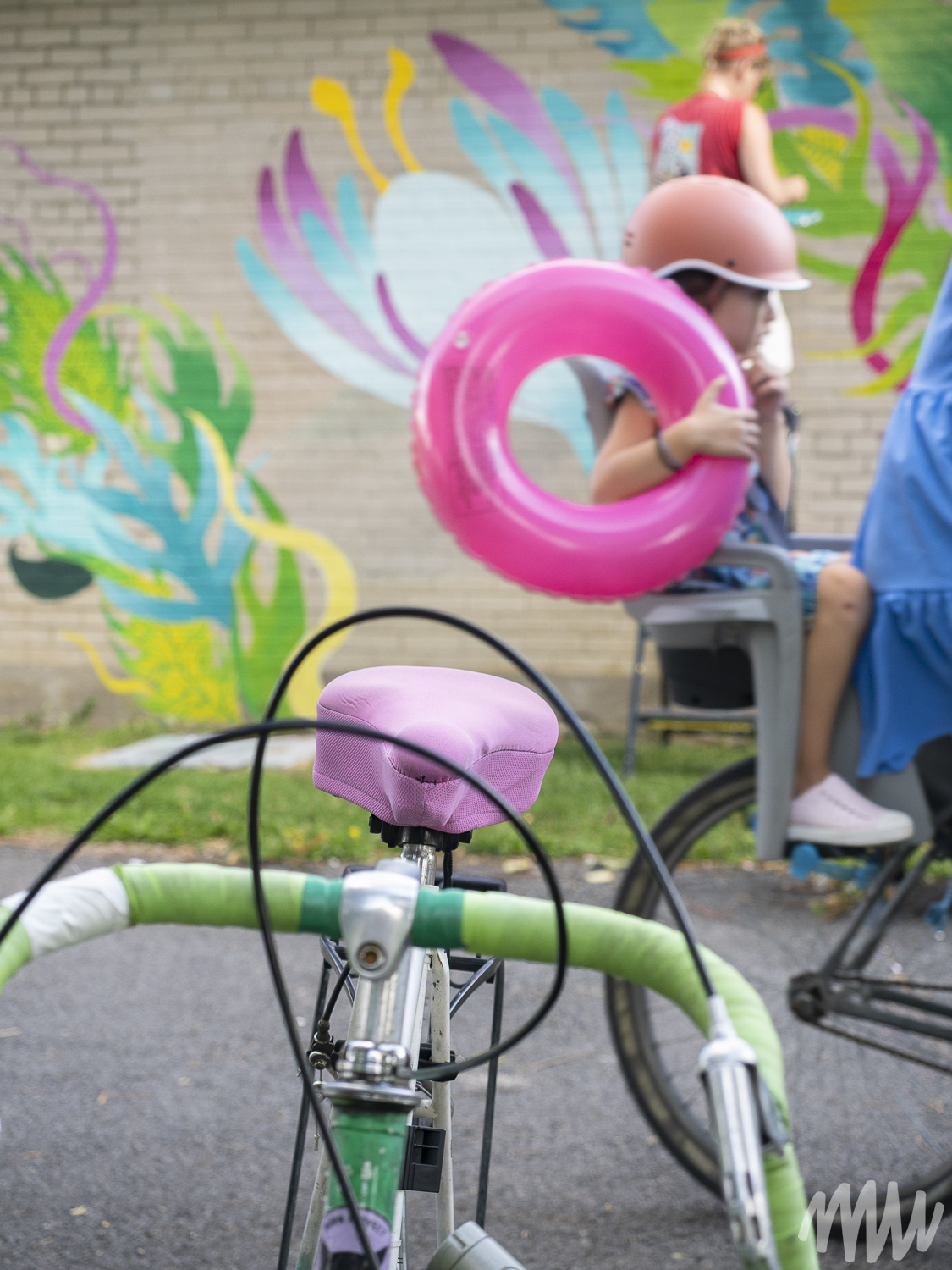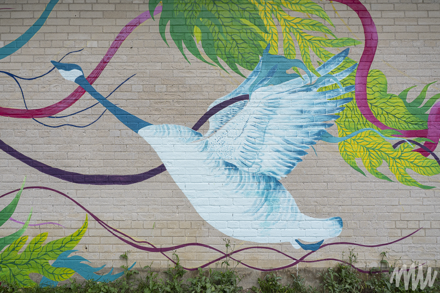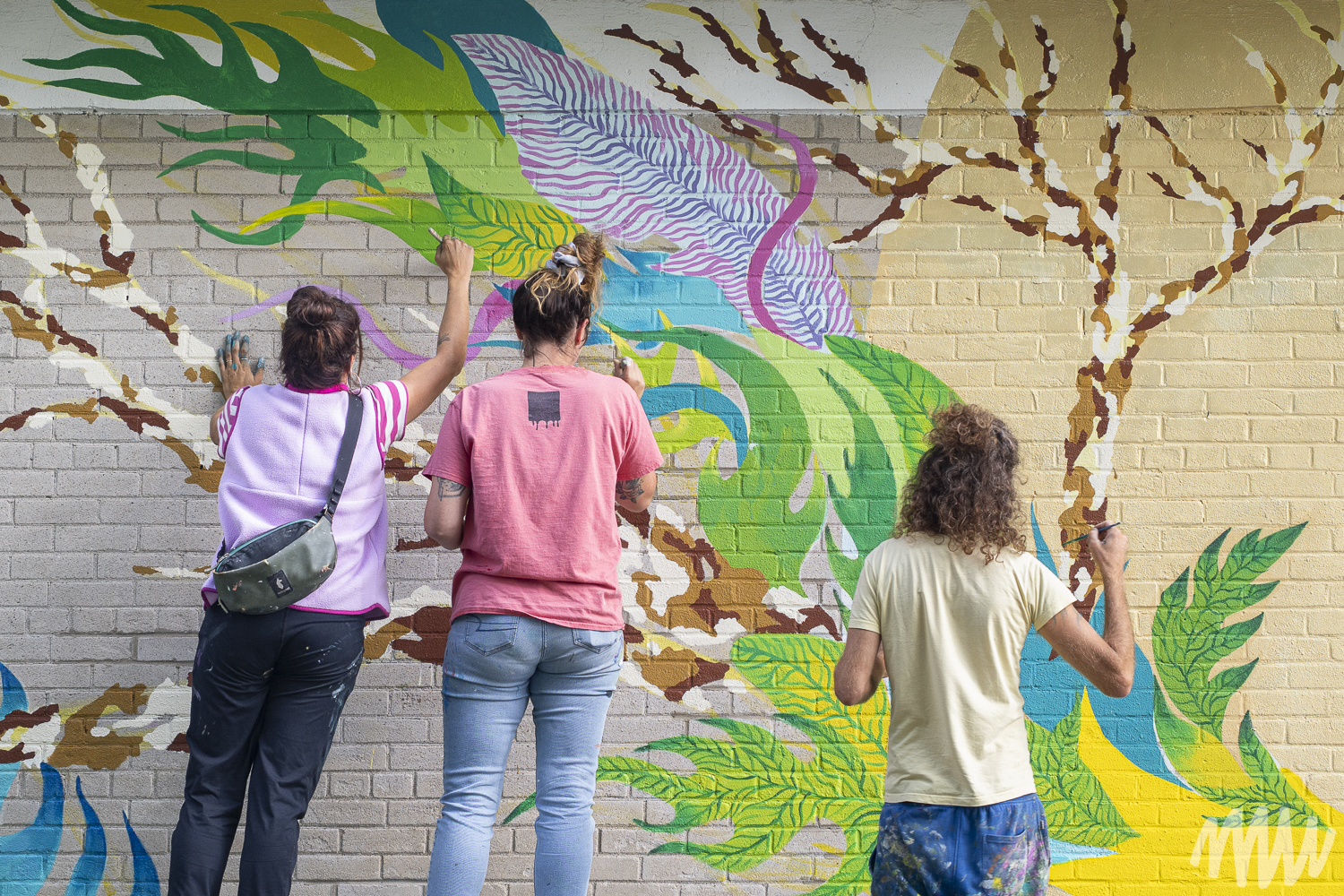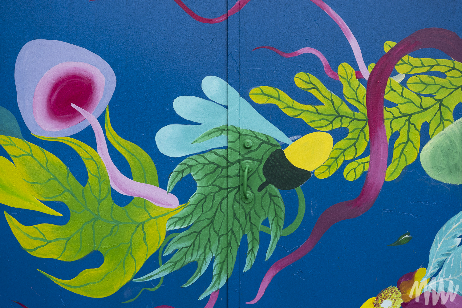 Déployée sur trois façades, la fresque aux formes végétales et aériennes métamorphose le pavillon des baigneurs en un point d’ancrage visuel vibrant et méditatif. Une célébration du vivant au cœur de la ville.