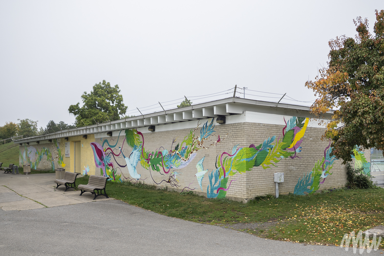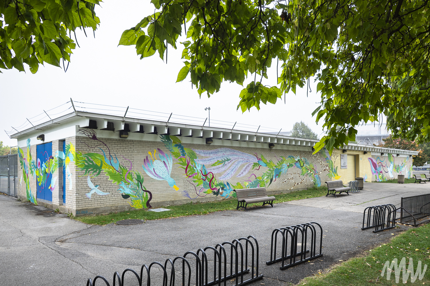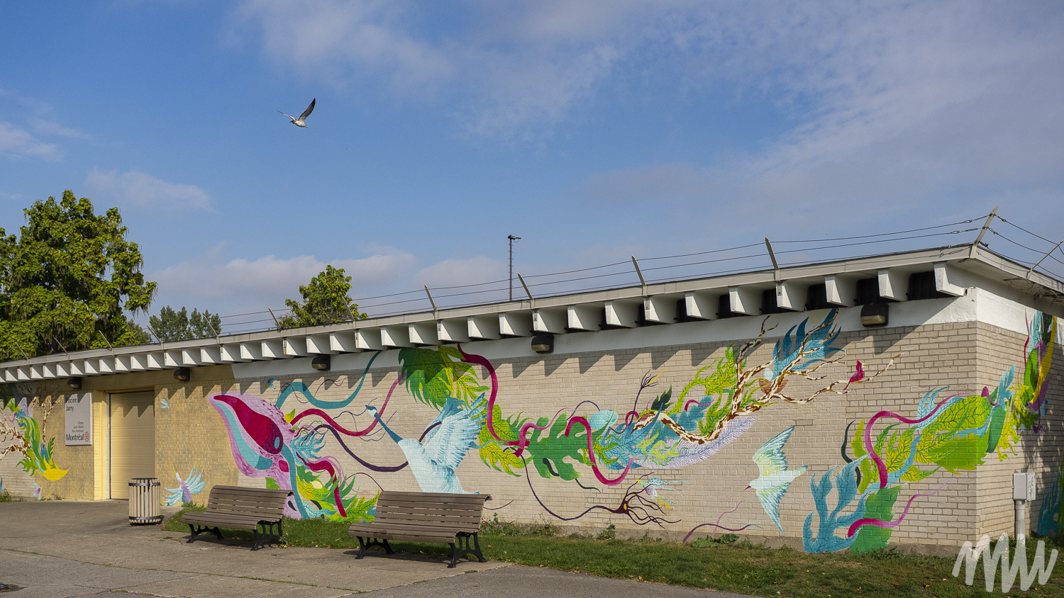 À l’occasion du centenaire du parc Jarry, l’Arrondissement de Villeray–Saint-Michel–Parc-Extension a confié à MU la réalisation d’une murale monumentale sur le pavillon des baigneurs qui abrite la piscine municipale, au cœur du parc. C’est l’artiste italien Gola Hundun, reconnu pour son approche profondément écologique, qui a été invité à concevoir cette œuvre unique. Inspirée par les rythmes de la faune et de la flore, sa création explore les liens sensibles qui unissent les êtres vivants à la biosphère.