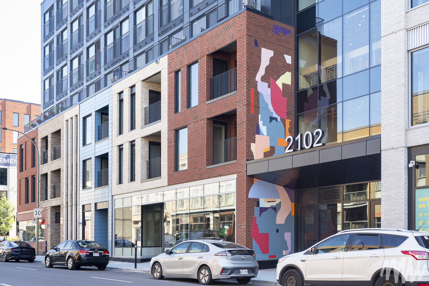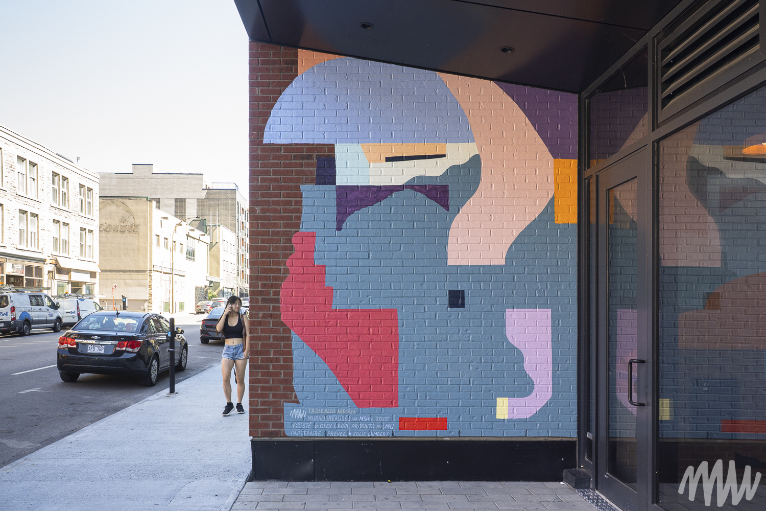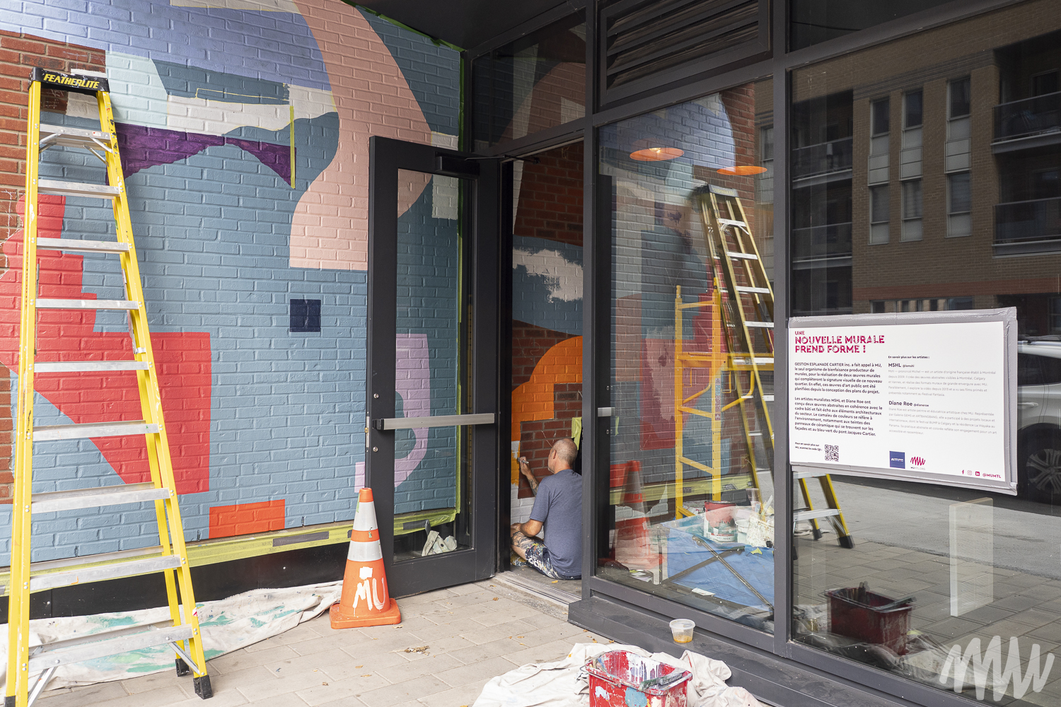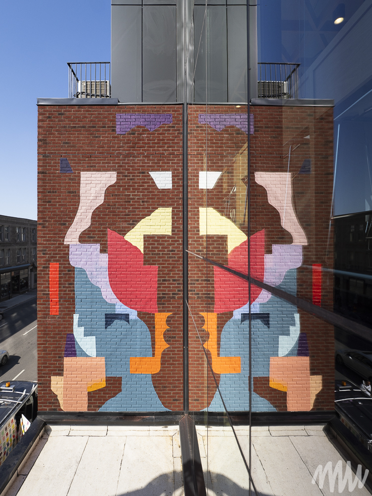 MSHL, d’origine française, est un artiste autodidacte primé qui a nourri son travail d’autres influences comme Matisse, Ricardo Cruz Diez et Vasarely, entre autres. Il évolue aujourd’hui dans un univers abstrait et géométrique où la place de chaque élément se justifie par rapport aux autres. Pour son œuvre, les couleurs qu’il a choisies reprennent les tonalités de bleu que l’on retrouve sur les briques en façade du bâtiment.