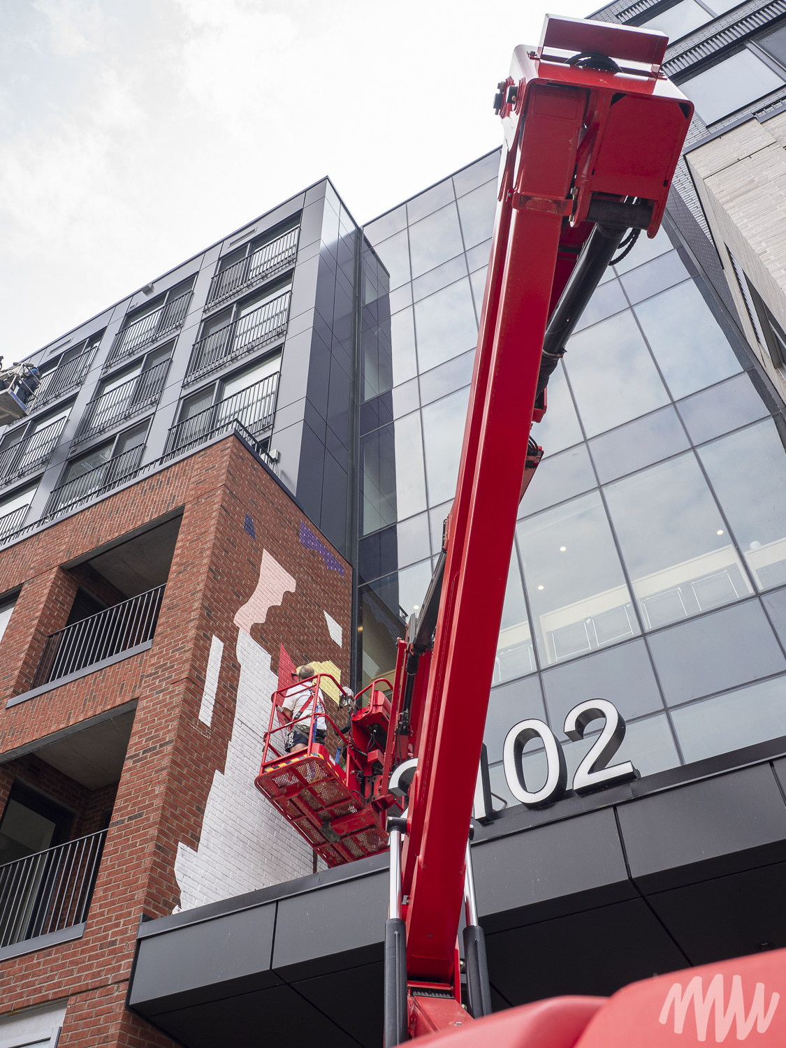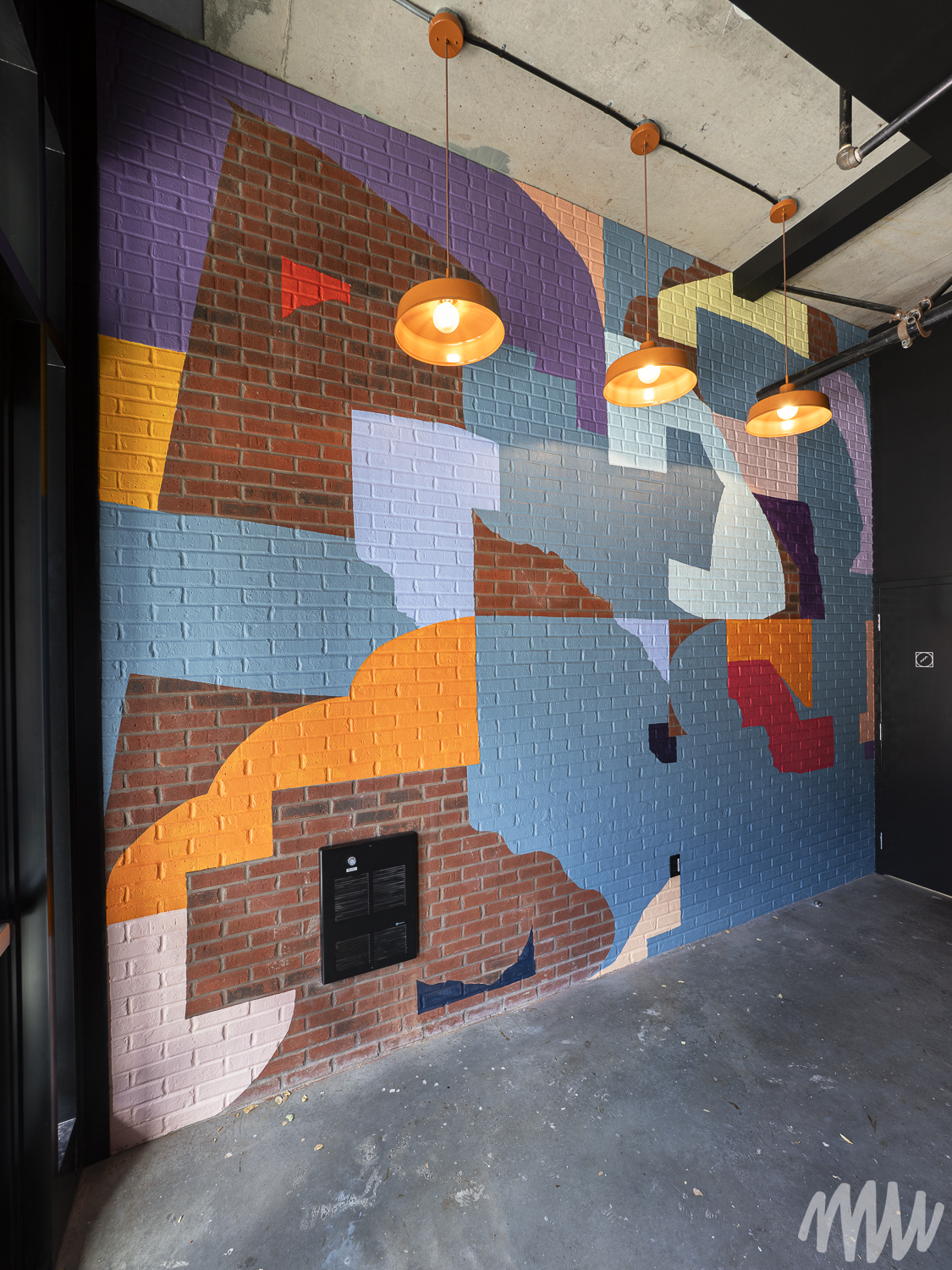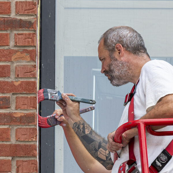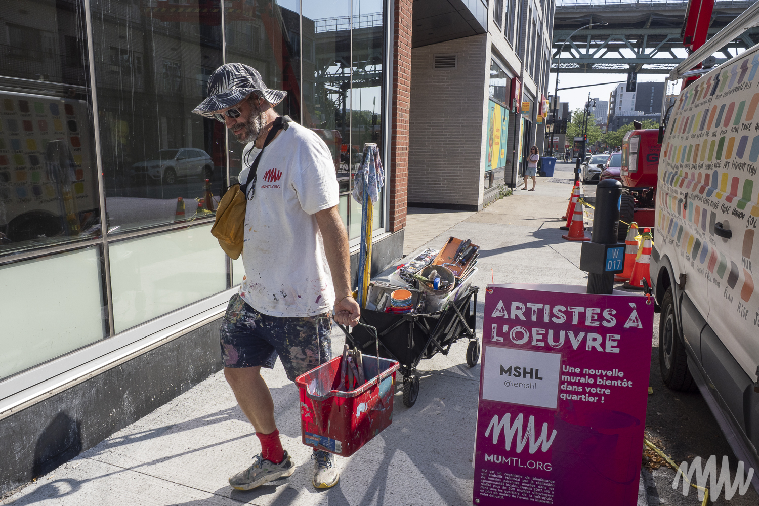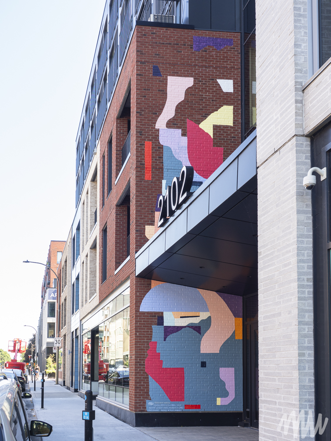 MSHL, d’origine française, est un artiste autodidacte primé qui a nourri son travail d’autres influences comme Matisse, Ricardo Cruz Diez et Vasarely, entre autres. Il évolue aujourd’hui dans un univers abstrait et géométrique où la place de chaque élément se justifie par rapport aux autres. Pour son œuvre, les couleurs qu’il a choisies reprennent les tonalités de bleu que l’on retrouve sur les briques en façade du bâtiment.